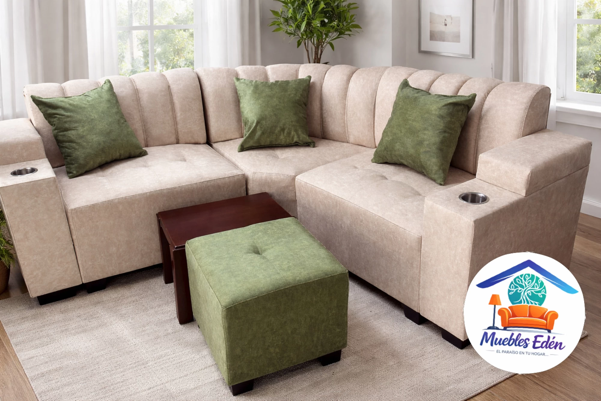 Sala tipo curva lineal con brazos y portavasos integrados.Incluye puff, mesa de centro y cojines decorativos para brindar mayor comodidad y estilo a tu espacio.Fabricada en tela antifluido, resistente y amigable con las mascotas, ideal para el hogar y fácil de limpiar.Disponible en el color y la textura de tu preferencia, para que combine perfectamente con tu decoración.