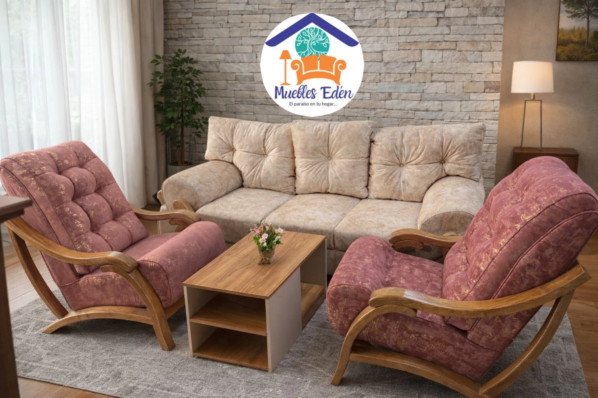 Sala Real: Incluye un elegante sofá de 3 puestos, dos sillas en madera (flor morado o cedro) con acabado en color natural o en el tono que prefieras, y un puff. La mesa de centro de lujo puede ser en espejo o en madera de alta calidad (RH), según tu elección. Además, cuenta con tres cojines y respaldo en algodón siliconado para mayor confort. Las telas son antifluido, de alta calidad y amigables con las mascotas, y están disponibles en el color que desees para que puedas personalizarla a tu gusto.